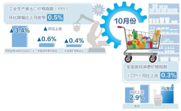国家统计局数据显示,10月份,消费市场运行总体平稳,食品价格高位回落,叠加汽油价格下行,全国居民消费价格指数(CPI)环比下降0.3%,同比上涨0.3%。扣除食品和能源价格的核心CPI略有回升,同比上涨0.2%,涨幅比上月扩大0.1个百分点。