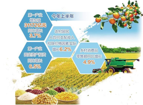 国家统计局最新数据显示,上半年第一产业增加值31172亿元,同比增长3.7%。今年以来,农业农村部门全力抓好粮食和重要农产品稳产保供,毫不松懈巩固拓展脱贫攻坚成果,统筹推进乡村产业发展、乡村建设和乡村治理,农业农村经济运行总体平稳、稳中向好,夏粮稳产丰收,农民稳步增收,农村稳定安宁,为国民经济平稳运行提供了坚实支撑。