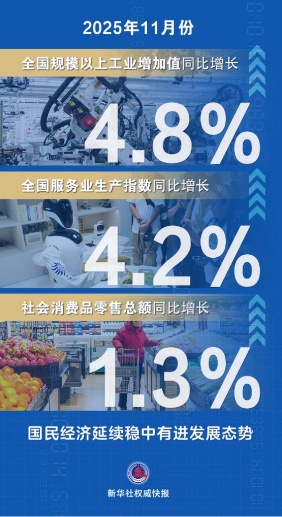 国家统计局12月15日发布数据显示 11月份 全国规模以上工业增加值同比增长4.8% 全国服务业生产指数同比增长4.2% 社会消费品零售总额同比增长1.3% 国民经济延续稳中有进发展态势