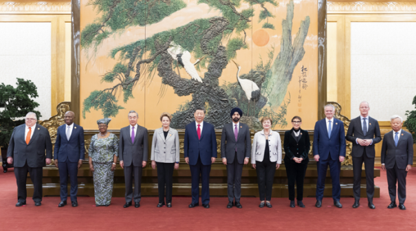 习近平同主要国际经济组织负责人合影留念,感谢他们长期支持中国现代化事业。