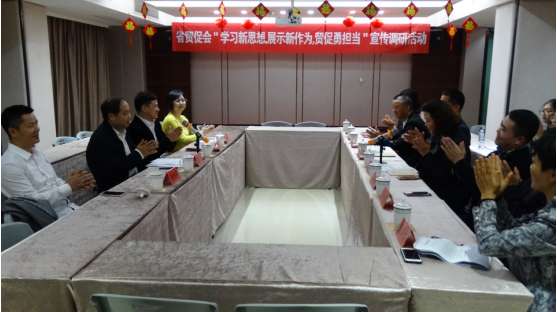 为贯彻落实中共福建省委关于在全省进一步兴起习近平新时代中国特色社会主义思想“大学习”热潮的通知要求,大力弘扬习近平总书记在福建工作时倡导的“四下基层”优良作风,持续推进“两学一做”教育活动,扎实开展“不忘初心、牢记使命”主题教育,更好谋划2019年度全省贸促工作。2018年11月,福建省贸促会组织开展了“学习新思想、展示新作为、贸促勇担当”专题宣传调研活动。福建省贸促会党组书记、会长陈震,党组成员、副会长傅健、谢续华、陈扬分率工作组赴9市(厦门除外),围绕“深入学习宣传习近平新时代中国特色社会主义思想和党的十九大精神,交流贸促系统党的政治建设、党风廉政建设情况;了解各级贸促会履职担当、服务中心工作的好经验;了解市县两级贸促会自身建设、商会工作等情况;收集2019年度工作建议和要求;与当地党政领导沟通,推进解决贸促会存在的问题”等五个方面重点内容进行专题宣传调研。