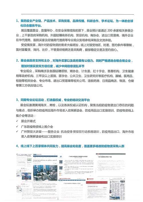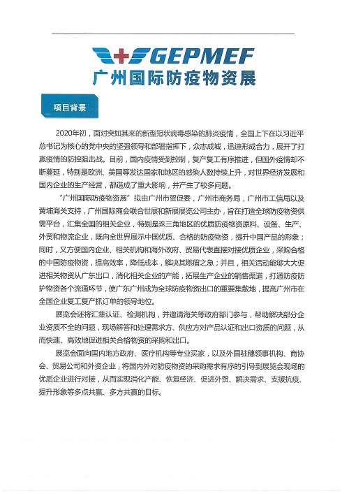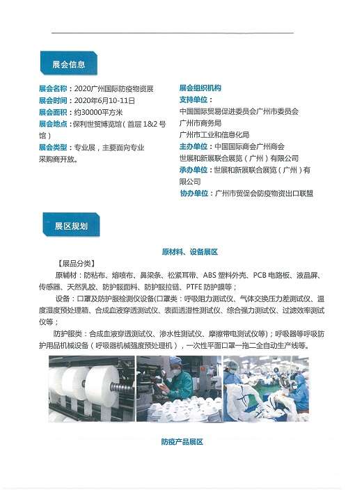 为贯彻落实习近平总书记关于夺取疫情防控和经济社会发展“双胜利”的重要指示精神,根据市委、市政府关于做好“六稳”“六保”的工作要求,由广州市贸促会、广州市商务局、广州市工业和信息化局支持,广州国际商会、世展和新展联合展览(广州)有限好博平台共同主办的“2020年广州国际防疫物资展览会”定于2020年6月10-11日在广州琶洲保利世贸博览馆举办。