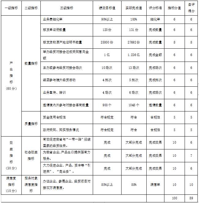 二、自评结果。“产出指标”满分60分,自评得分60分。其所属8个子项目指标均超额完成;“满意度指标”满分10分,自评得分10分; “效益指标”满分30分,自评得分19分。合计自评得分89分,级别良好(详见附件)。